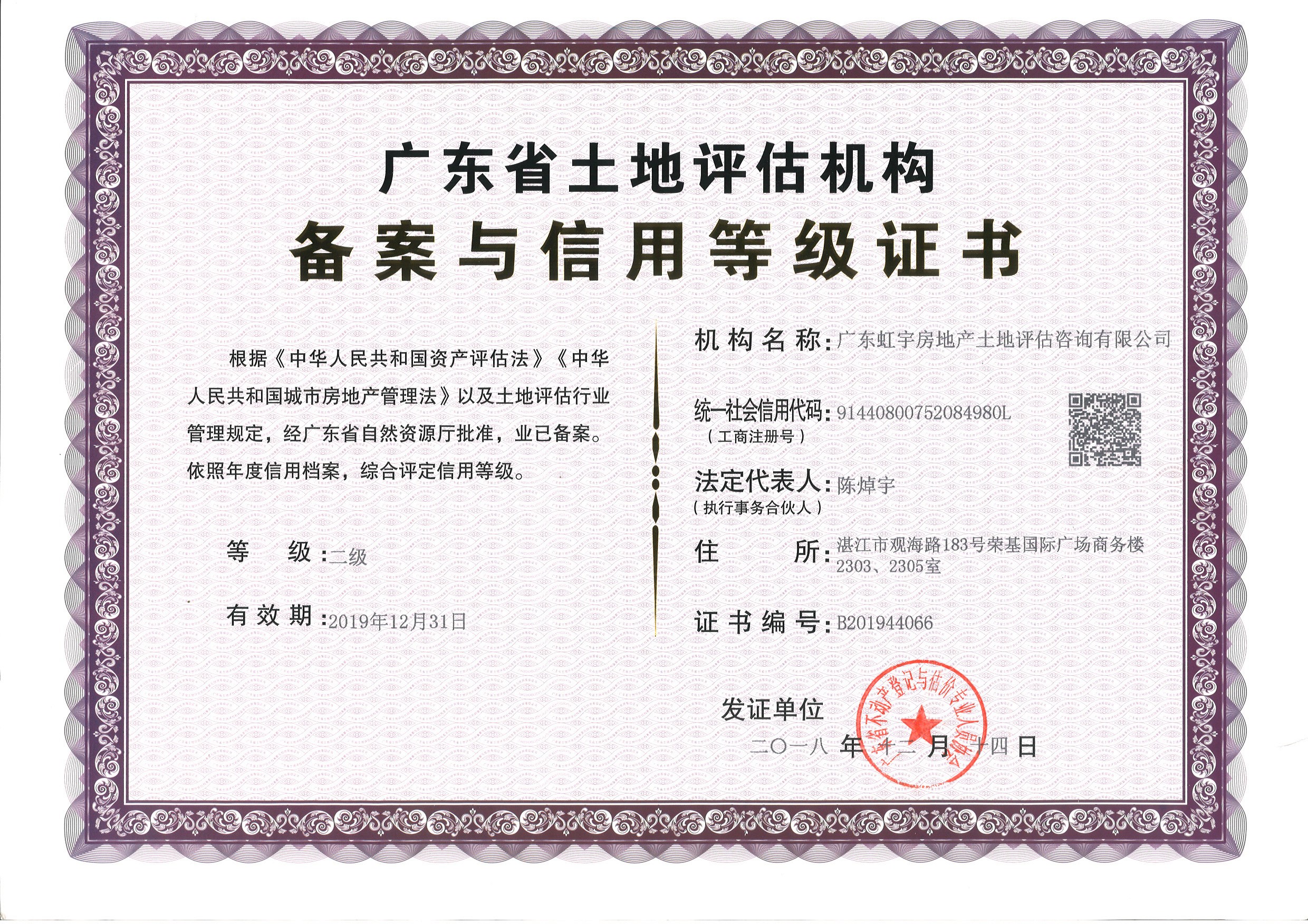 廣東省土地評估機(jī)構(gòu)備案與信用等級證書